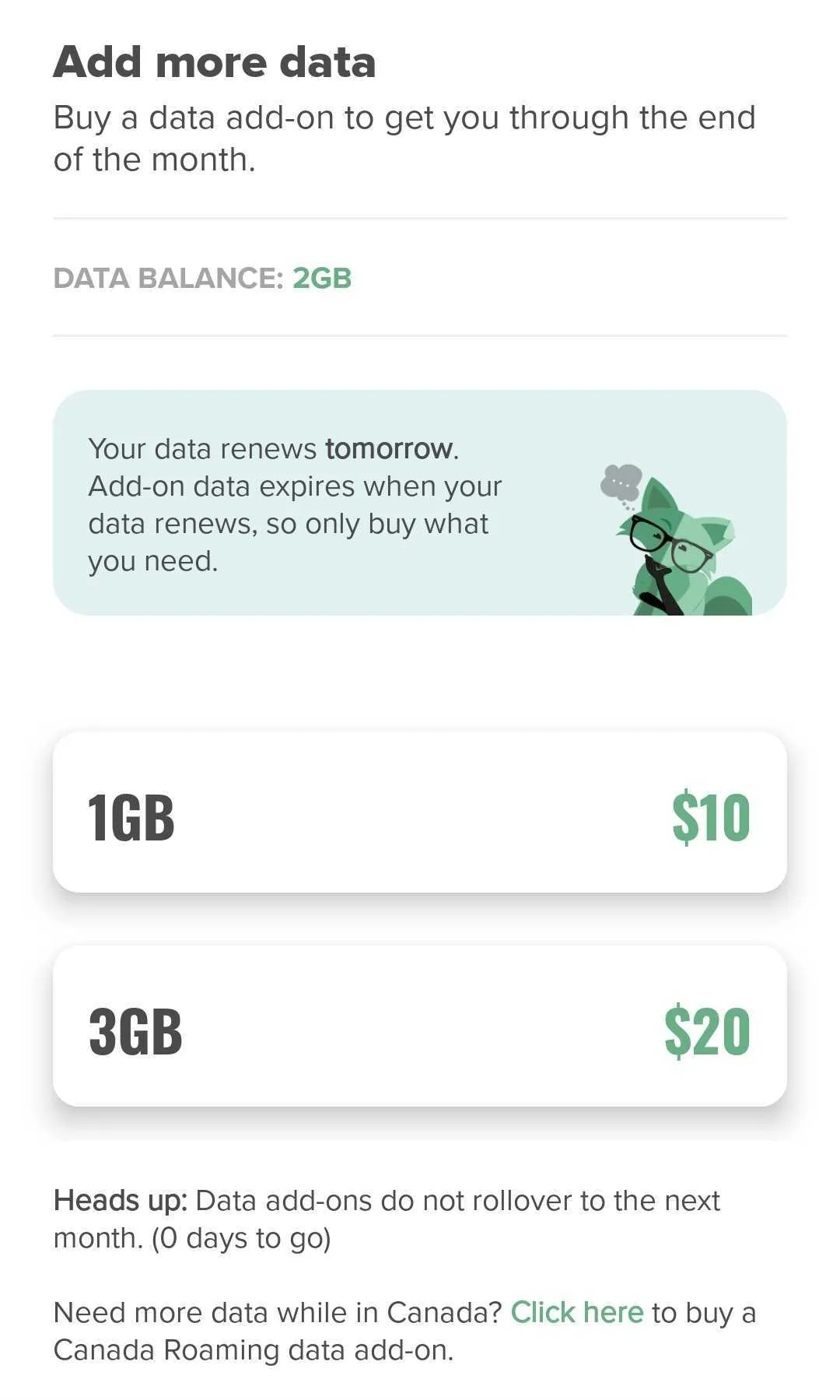 The Mint Mobile app allows you to add more data at any time. Heed the warning that data does not roll over to the next month. You can also see how much you’ve already used, and when it renews again.