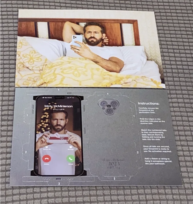 In 2023, Mint Mobile customers got this hilarious Christmas ornament—a cardboard phone with the image of Ryan Reynolds or “Minty McMinterson” trying to call you.