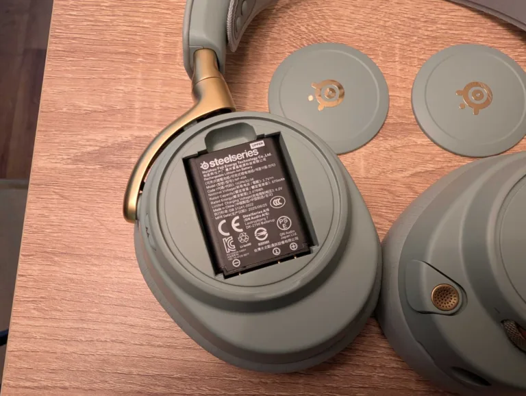 With a full battery charge under two hours away from the GameHub, there's no need to be out of juice ever. And if you're fast, you can keep the Elites powered on during the battery swap because they stay powered on for around nine seconds. That's possible with practice. Get your replacement battery ready to go. Screw off the magnetic cover on the right earcup. Then hot swap in the replacement battery.