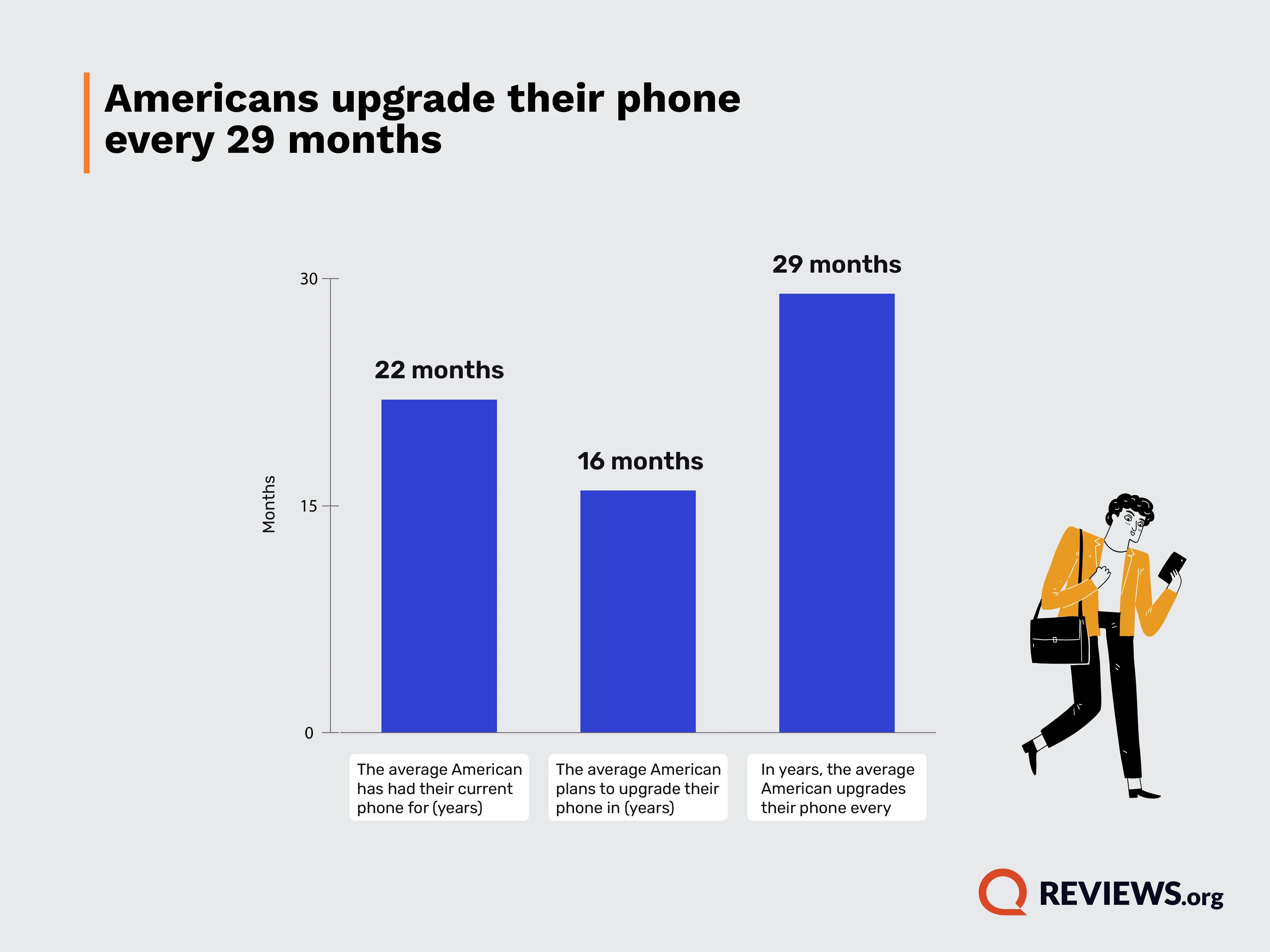 However, there’s a clear gap between intentions and behavior. Based on self-reported upgrade habits, the average American actually upgrades their smartphone about every 29 months.