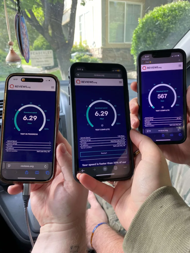 Testing download speeds side by side in a dead zone near my condo. My 4G phone (middle) proved competitive, matching an iPhone 13's 5G speed (left) and beating an iPhone X’s 4G speed (right). Photo by Brenna Elieson